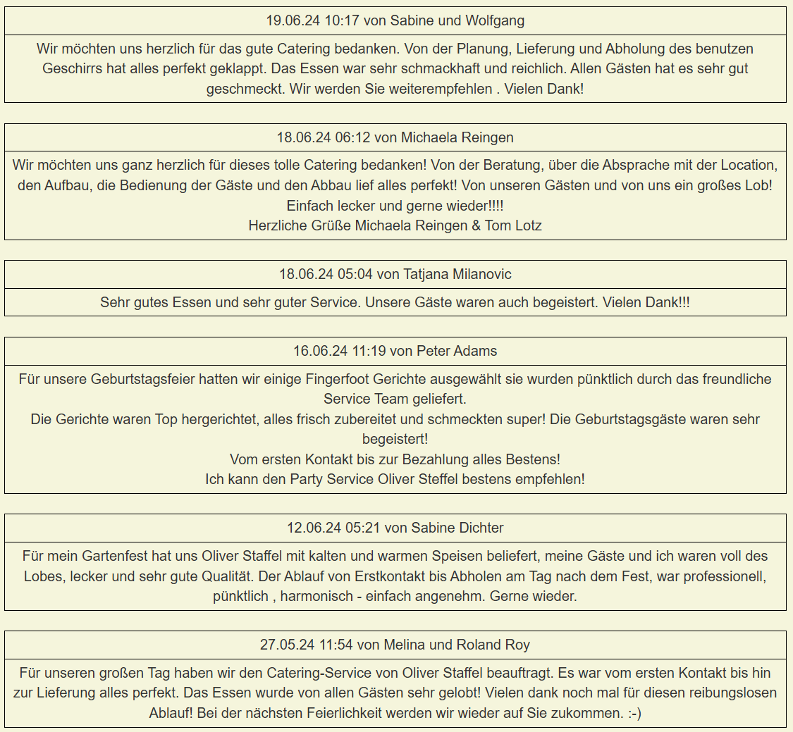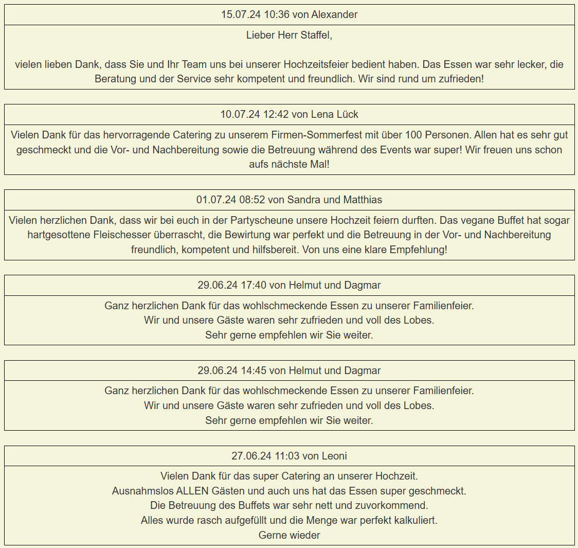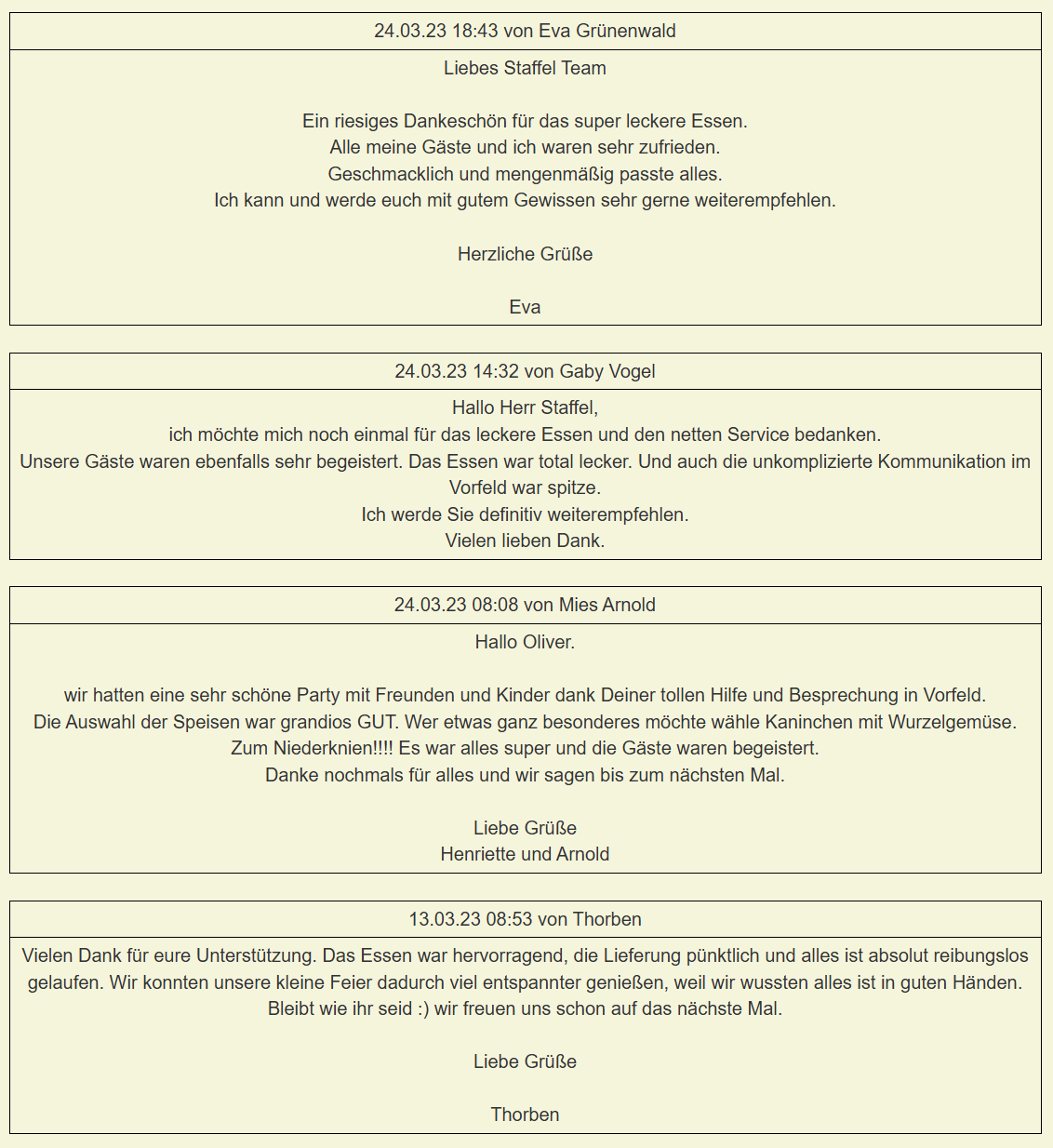 Vielen Dank für das tolle Catering Herr Staffel und Team. Das Essen hat die Gäste regelrecht begeistert. Es war alles sehr unkompliziert, die Bestellung einfach und der Service hervorragend und sehr freundlich.