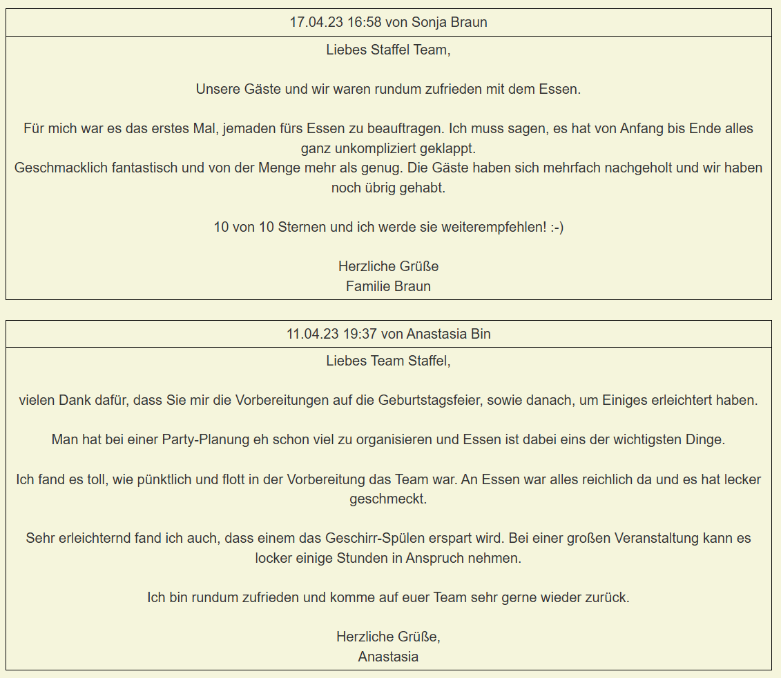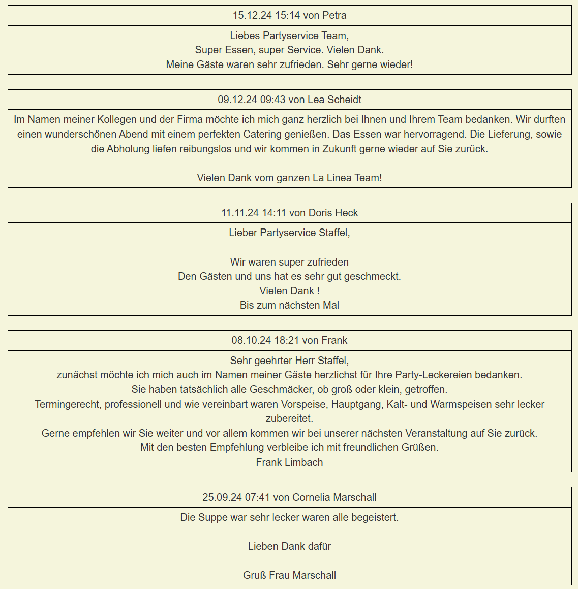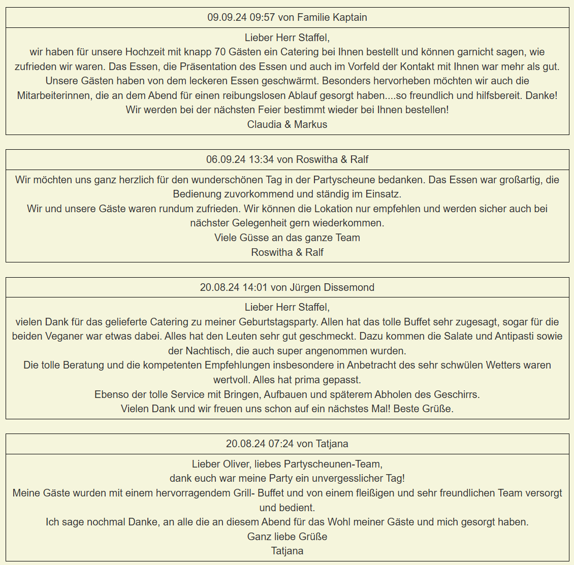 Vielen Dank für das tolle Catering Herr Staffel und Team. Das Essen hat die Gäste regelrecht begeistert. Es war alles sehr unkompliziert, die Bestellung einfach und der Service hervorragend und sehr freundlich.