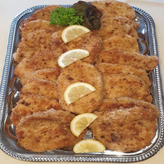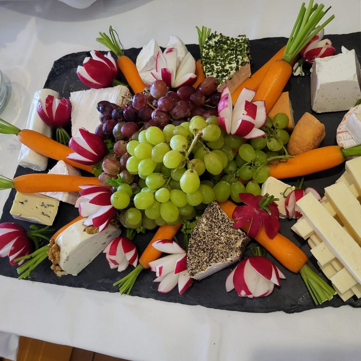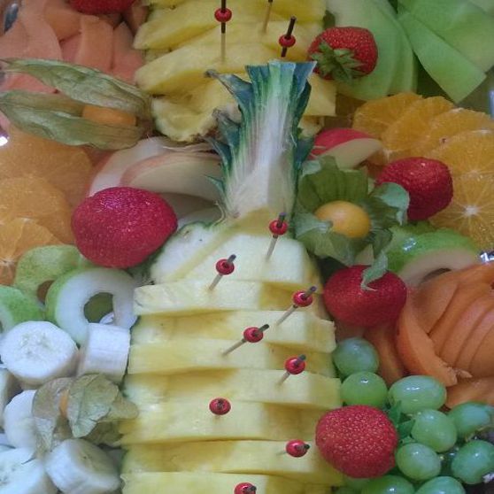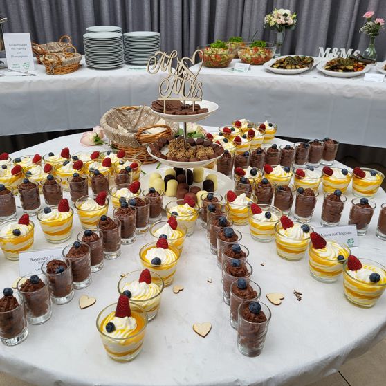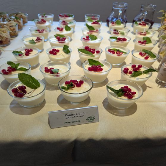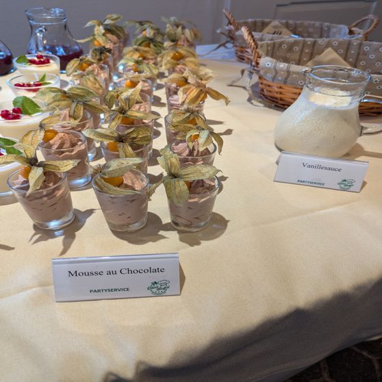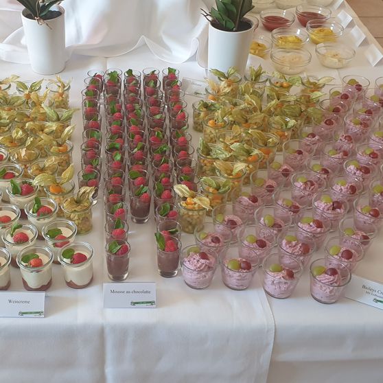 Bayrsiche Creme mit Mangosauce Mousse au chocolate mit Vanillesauce Panna Cotta mit Himbeersauce aufgeschnittene Obstauswahl kleine panierte Schnitzel Käseauswahl mit Radieschen, Trauben