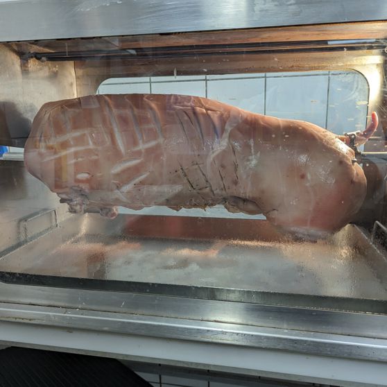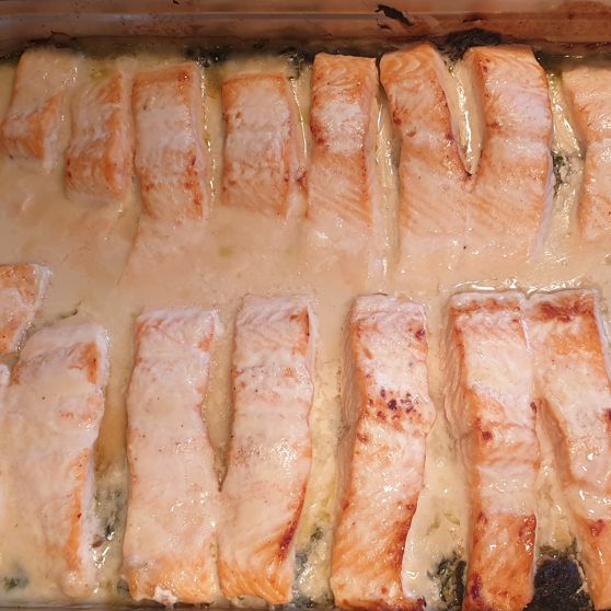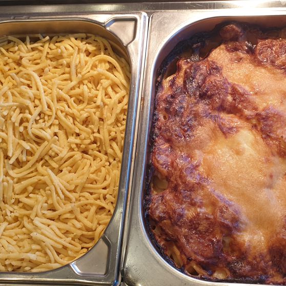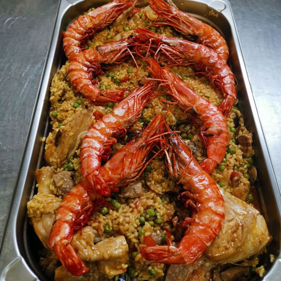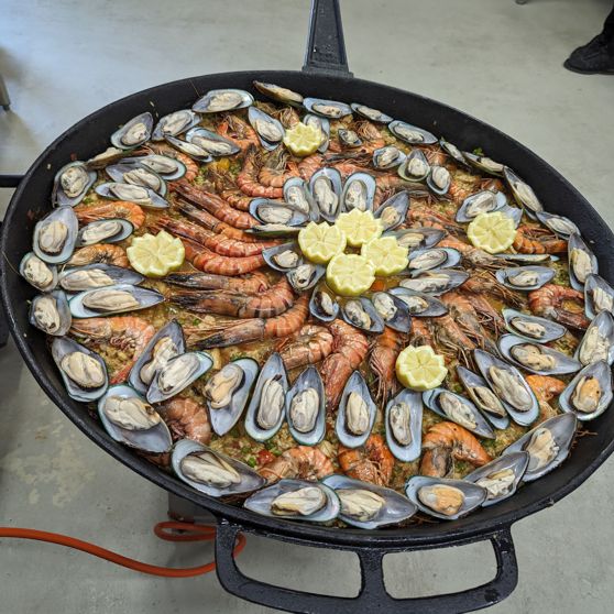 Paella in der Riesenpfanne gebratenes Lachsfilet auf Blattspinat Paella mit Fleisch und Fisch Schweinebraten mit Zwiebelsauce Spätzle & Kartoffelgratin gebratenes Spitzkohlgemüse Desserts